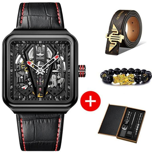 Mechanical Watch Skeleton Steampunk Design Automatic Sapphire Crystal Square Leather Transparent sport Wristwatch
