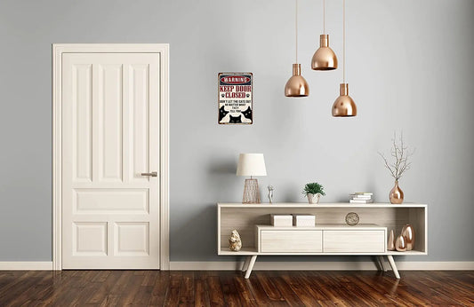 Funny Black Cat Warning Decor Retro Metal Tin Sign - Keep Door Closed Don't Let The Cats Out No Matter What They