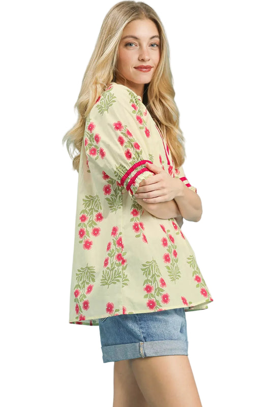 Umgee Floral V-Neck Puff Sleeve Top