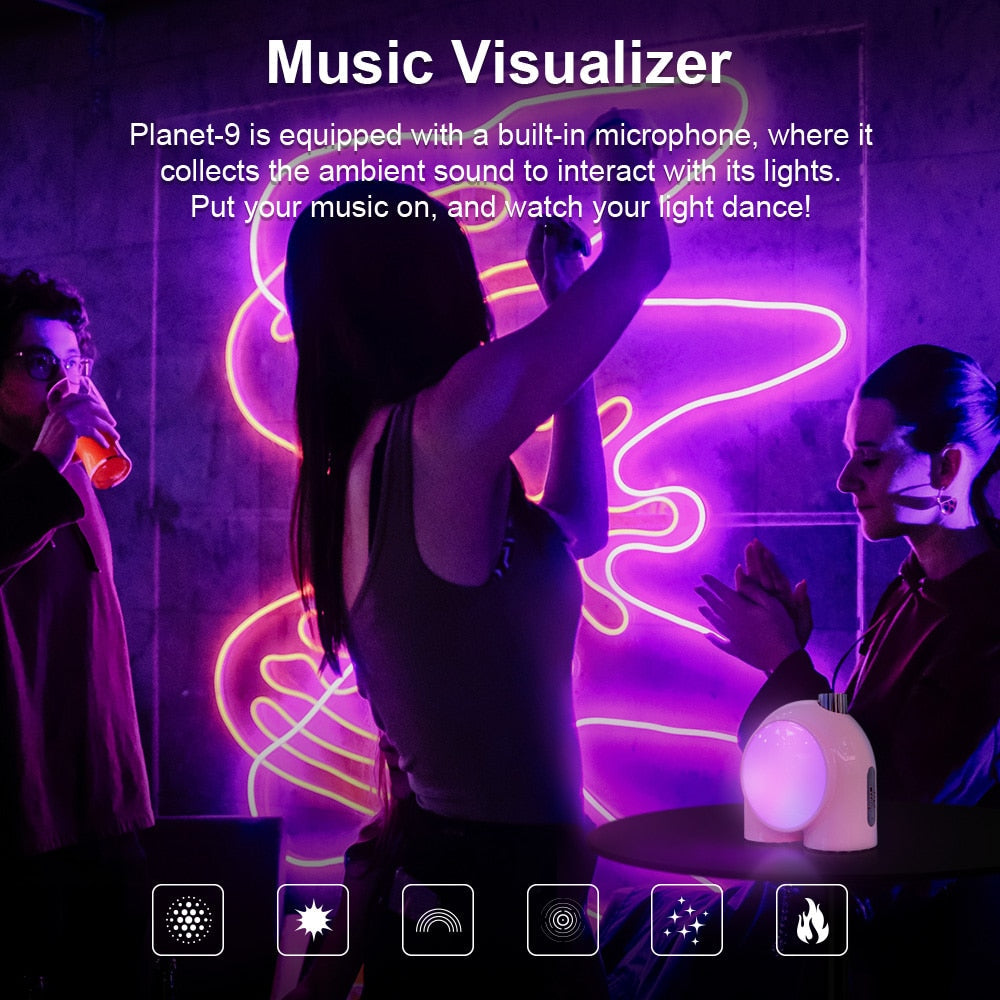 Planet-9 is equipped with a built-in microphone, which collects the ambient sound to interact with its lights. Put your music on, and watch your light dance!