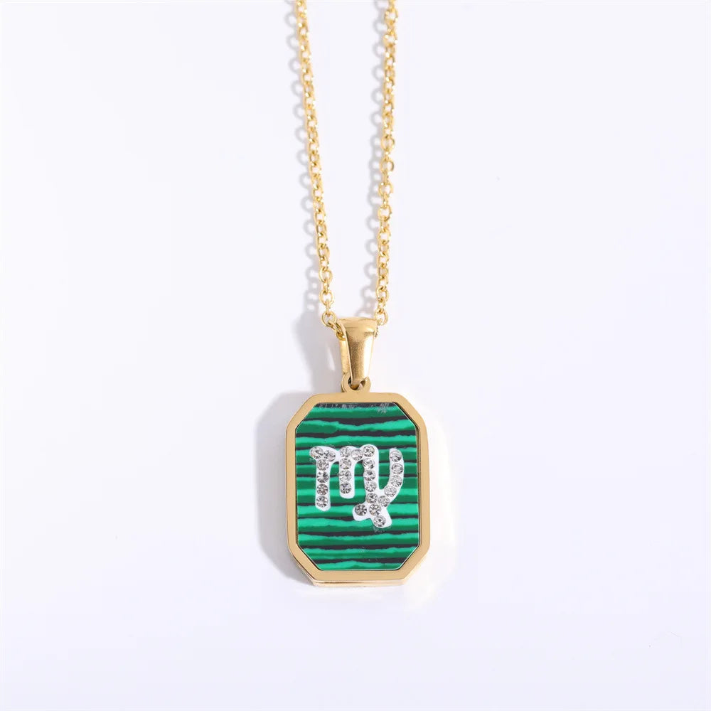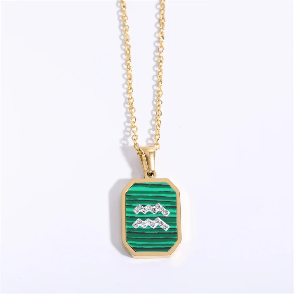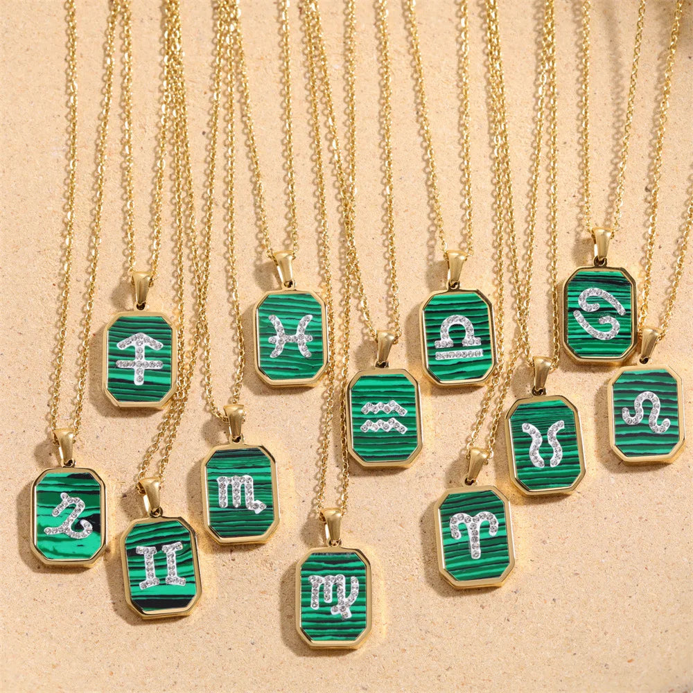 Exquisite Zodiac Constellation Necklace: Gold-Plated Stainless Steel with Zircon Crystals and Malachite Accent