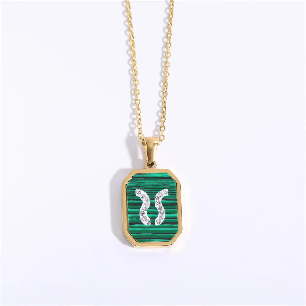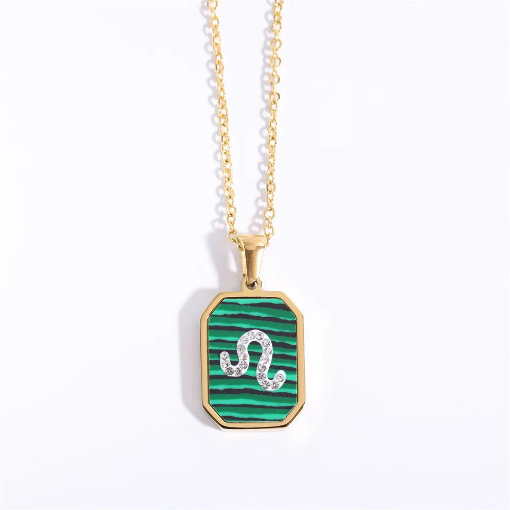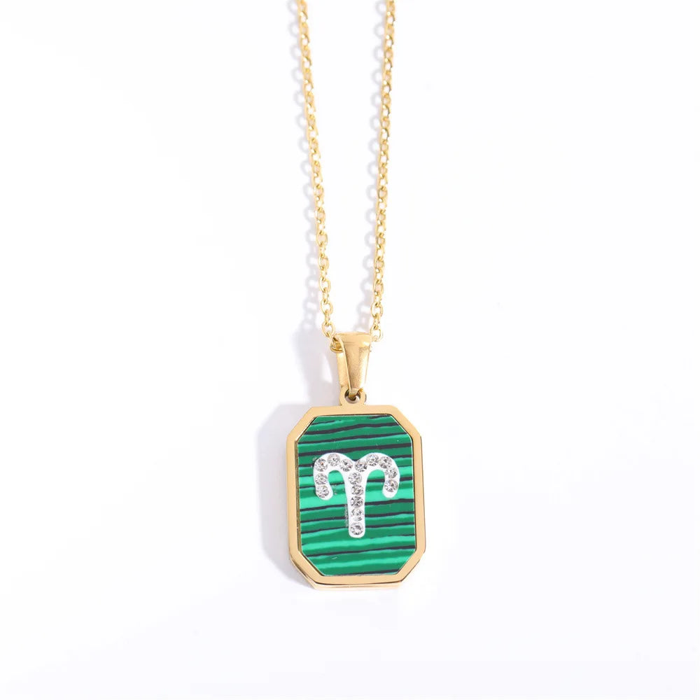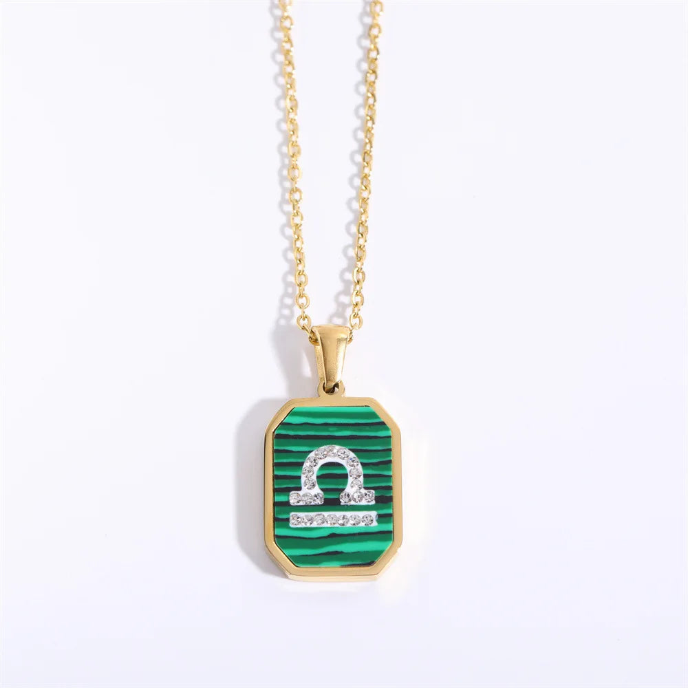 Exquisite Zodiac Constellation Necklace: Gold-Plated Stainless Steel with Zircon Crystals and Malachite Accent
