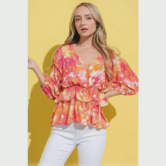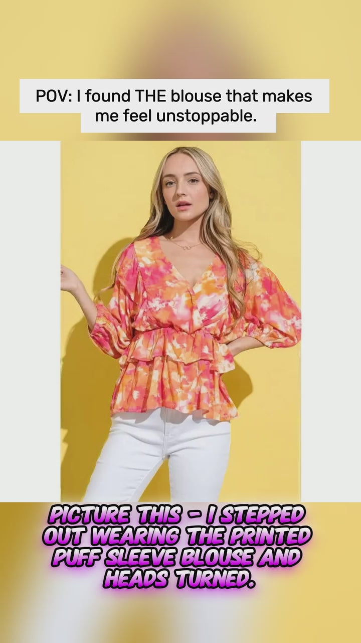 A ruffled printed puff sleeve blouse top is a fashionable and trendy piece that combines several popular design elements. The blouse typically features a printed fabric with a pattern or design, ruffled detailing along the neckline or sleeves, and puff sleeves that add volume and drama to the silhouette. This type of blouse is great for adding a touch of whimsy and femininity to your outfit and can be dressed up or down depending on your styling preferences.