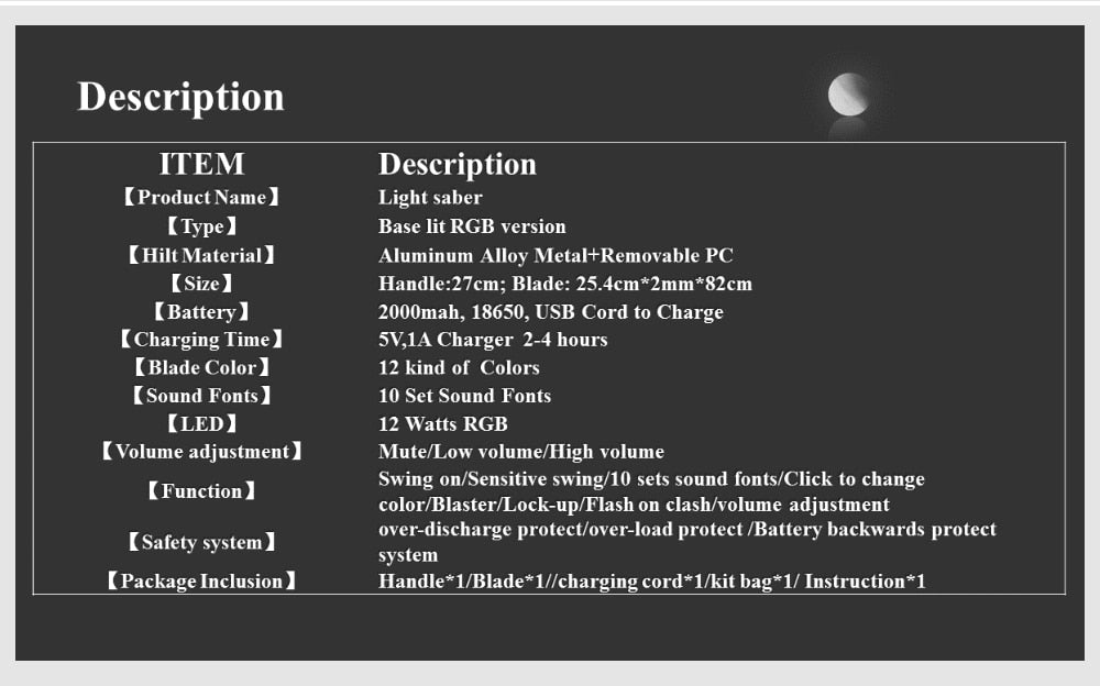 The lightsaber is a cutting-edge and visually striking accessory, featuring an RGB version with a base-lit aluminum alloy metal handle that measures 27cm, complemented by a removable PC handle. The blade, extending to 25cm, is powered by a 2000mAh 18650 battery and can be conveniently charged using a USB cord. Boasting a remarkable 12 watts of power, this lightsaber offers a diverse range of colors with its 12 kinds of color options. The device also includes 10 sets of sound fonts, providing an immersive experience for enthusiasts. With a warning against using it to cause harm, particularly avoiding aiming at eyes, this lightsaber makes for a captivating Halloween or Christmas gift. Suitable for various age groups, including 4-6 years, 7-12 years, 12 years and above, and 18+, this product carries the model number TS001 TS012. Crafted from metal, it is a unisex accessory that features flashing lights, making it an exciting and safe toy for all.