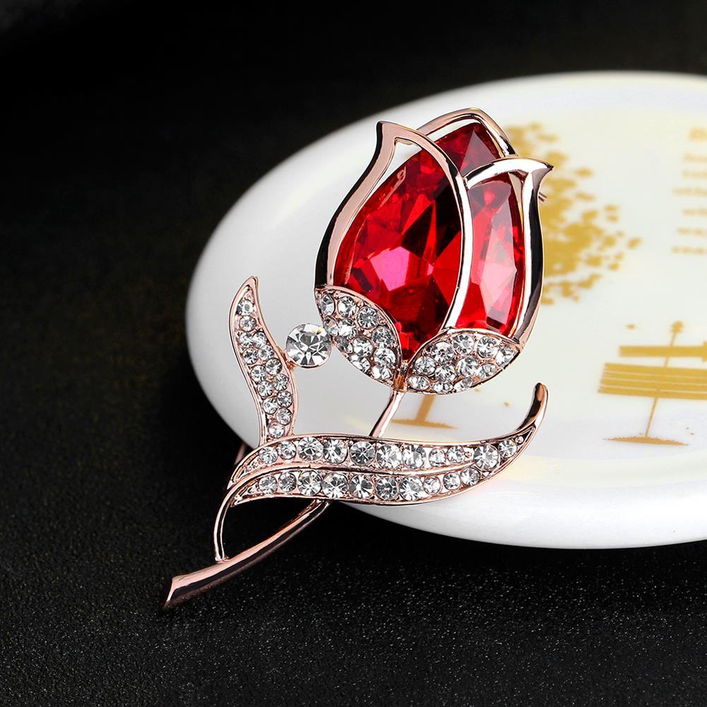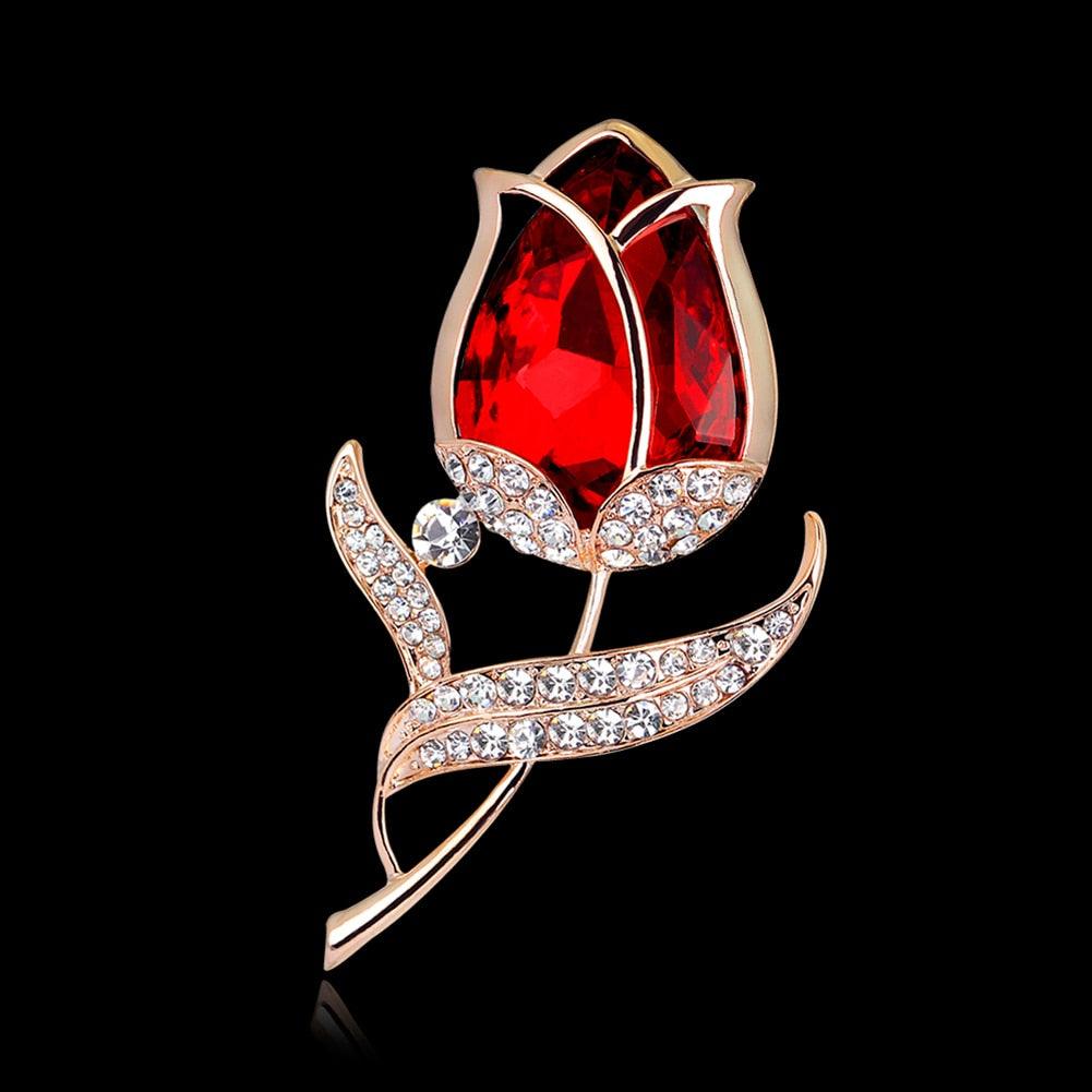 Red Rose Crystal Flower Brooch Pin Rhinestone Alloy