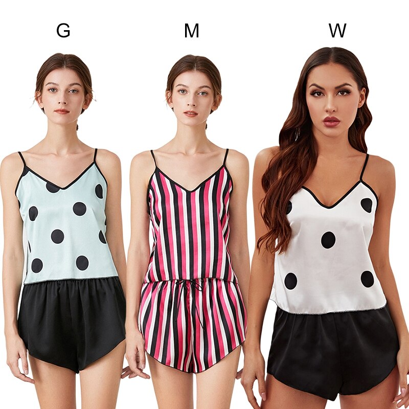 ►Two piece PJs set with a camisole & sexy shorts. Sleep top: sexy V-neck neckline and adjustable spaghetti straps. Sleep bottom: elastic drawstring waistband, polka dot, or tripped pattern, its casual style makes it not awkward even when guests visit.
